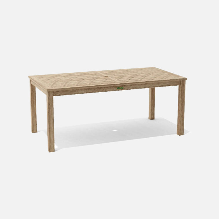 The Bahama 70” Rectangular Dining Table is a wide and robust outdoor teak table, designed for durability and timeless style. Seating up to six people, this table is perfect for enjoying outdoor dining with family and friends. Crafted from Genuine Solid A-Grade Teak Wood, it features a smooth, natural finish that enhances its elegant appeal. An umbrella hole in the center with a brass plug adds functionality, making it ideal for any outdoor setting.